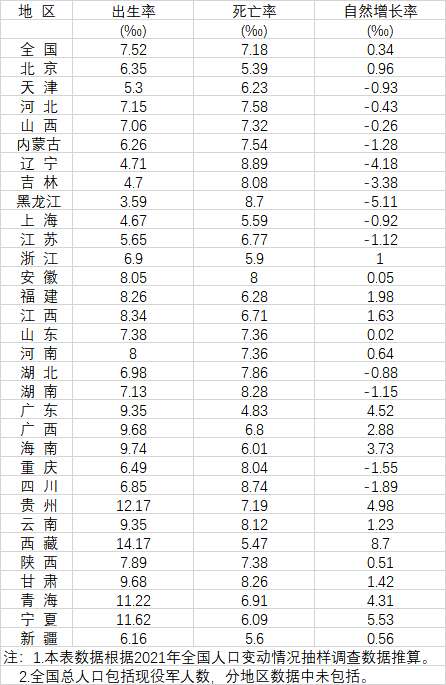 分地区人口出生率、死亡率和自然增长率(来源:《中国统计年鉴2022》)