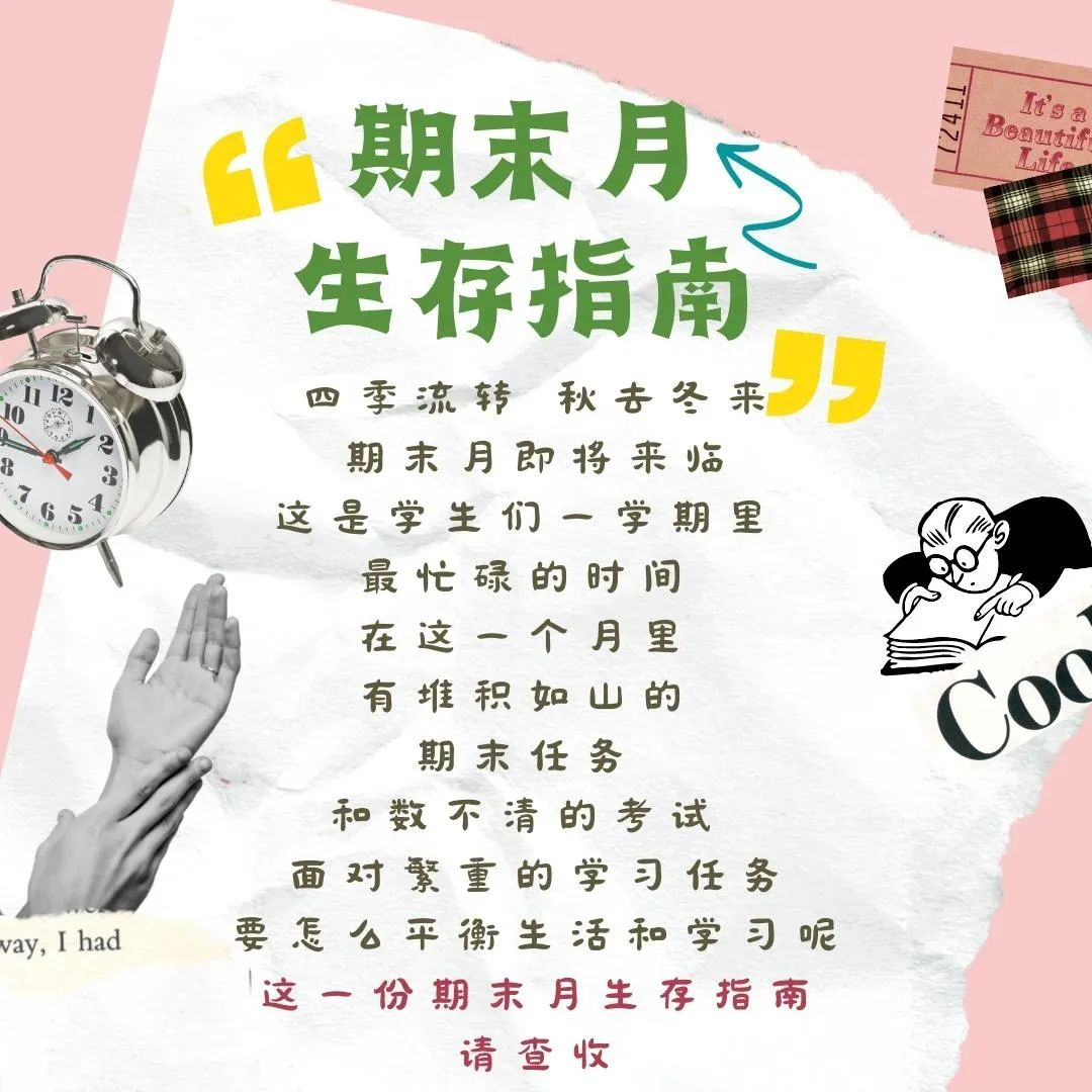 期末月即将来临,在这个月我们将面临堆积如山的期末大作业和数不清的考试。面对这些繁重的学习任务,我们要怎么平衡生活和学习呢?我们又该如何为期末考试做好充分的准备呢?这是一份期末月生存指南,请查收~