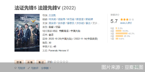 但是与高播放量形成反差的是,《法证先锋5》豆瓣开分成绩6分,刚刚达到及格线,截至发稿前,共6683人给出评价,超四成用户打出3星,评分仅5.7分。