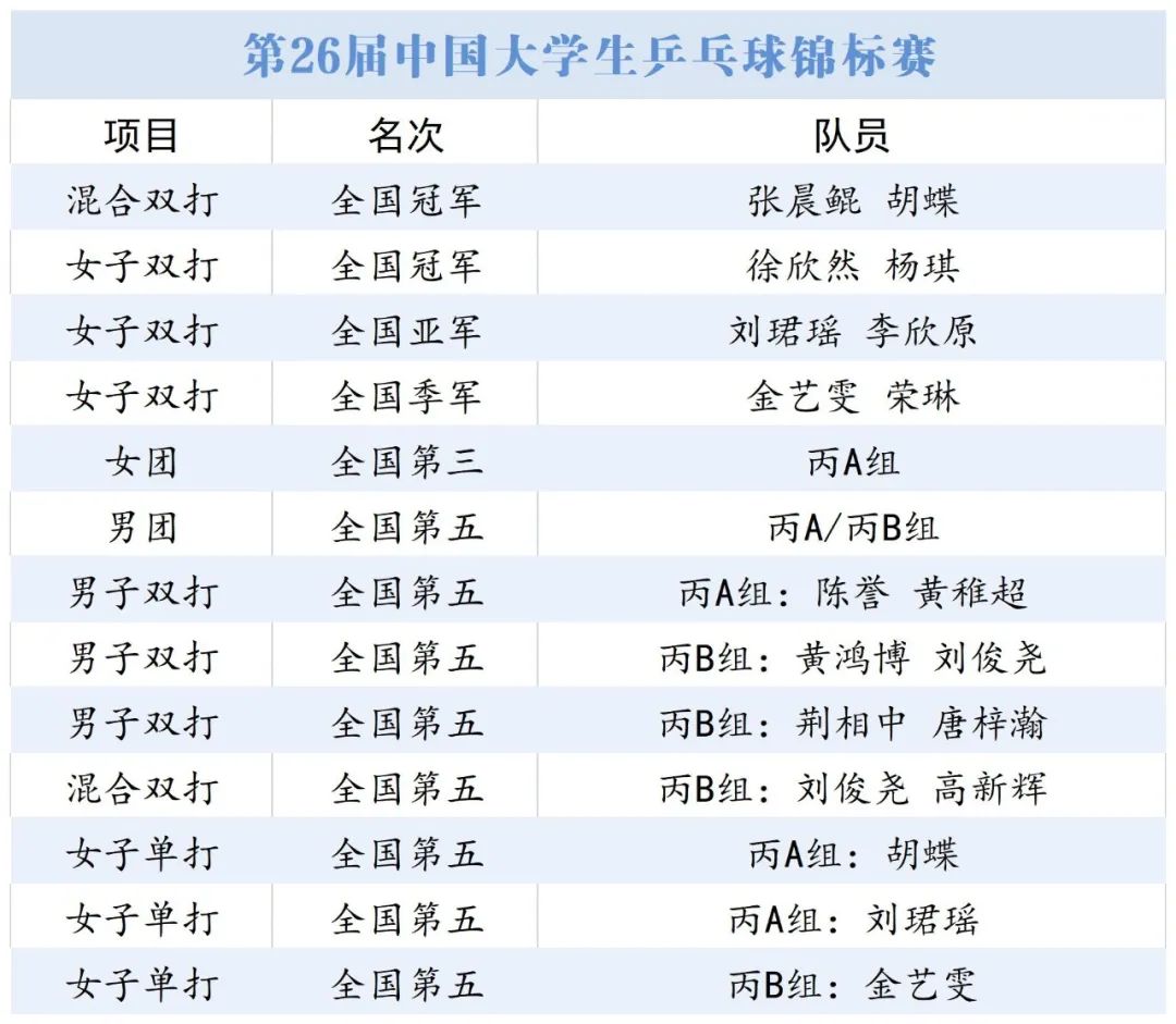 第26届中国大学生乒乓球锦标赛丙组比赛各组单项赛于8日-10日展开角逐。武汉大学代表队组成的混合双打均闯入全国八强。其中张晨鲲、胡蝶的混双配合默契,无论是技巧还是心理素质都展现出绝佳状态。赛场上,他们削、扣、杀、旋转球、弧线球、长球、短球,各种战术动作轮番上演。先后战胜南京航天航空大学、北京大学等几所强校,勇摘混双桂冠。