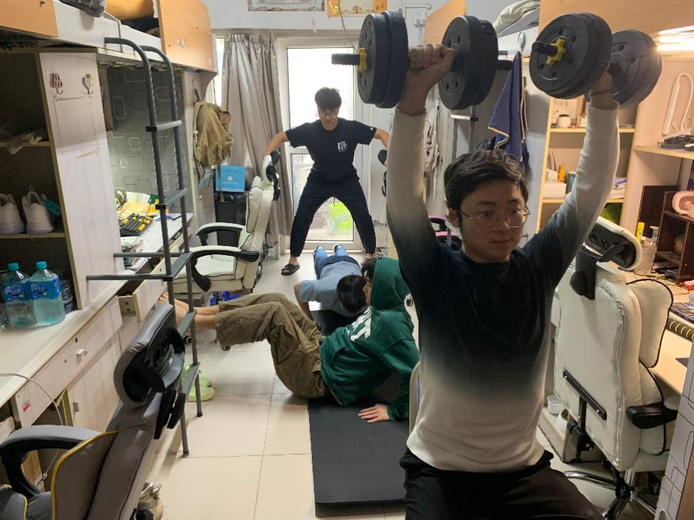 A区10舍810室,来自机械与运载工程学院2020级机自专业的四个大男生,疫情期间在寝室相互督促、坚持锻炼。“其实我们以前也各自有锻炼的习惯,但是这学期我们决定坚持得更好一点。”据了解,寝室成员中的张振最早开始锻炼,他也成了寝室的“小教练”。之前张振和另一位寝室同学邓舟会去健身房锻炼,疫情期间就在宿舍锻炼。另外两位同学贺星杰和高一翔也被带动起来,贺星杰买了哑铃,高一翔还会去爬楼梯。现在锻炼已经是810 寝室的日常了!