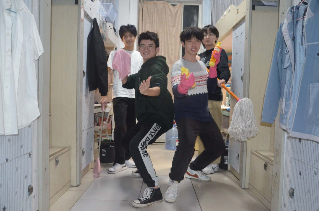 “疫情刚开始,大家是比较消极的,寝室也没人收拾,乱糟糟的。”来自光电工程学院A区11舍516室的寝室长许典坤说道,“但是在准备参评十佳文明寝室的过程中,我们翻出了之前的合照,里面有大家一起参加活动、还有把寝室打扫得干干净净的照片。一张张照片唤起了我们的回忆,以前每周四中午我们都会认真打扫卫生,看着打扫完干净整洁的寝室,总是满满的成就感。想到这里,看着周围杂乱的环境,便萌生了做一次寝室大扫除的想法。”谈起做大扫除,他说:“大家一起做扫除还挺开心的,我们一般都边放音乐边聊天,你帮我我帮你,不知不觉就把寝室打扫干净了”, “看着打扫干净的寝室,疫情以来心里积攒的阴霾好像也消失了!”另外一个同学补充道。只要大家一起,劳动也会变得很快乐啊!