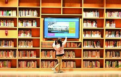 小读者在位于正定新区的石家庄市图书馆新馆使用电子屏查阅书籍。新华社发