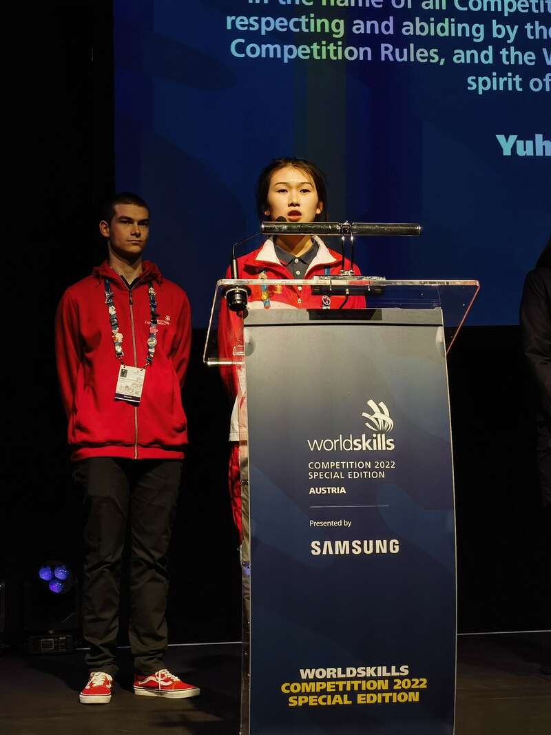 在开幕式上,来自河南化工技师学院的姜雨荷作为奥地利赛区选手代表宣誓,她将参与本次比赛的化学实验室技术项目,这一项目是对在企业质量控制部门、研究部门、环境保护部门进行产品质量检验、一般性化学物质的合成与处置、实验室组织与管理的竞赛项目。姜雨荷表示,她近期抵达赛区后一直在努力进行最后的冲刺训练,希望在世界技能大赛特别赛上取得佳绩,实现梦想。