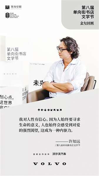 他们看新出来的网剧,跟我们那时候看金庸很像。我们这几代人,属于印刷文化的尾声。书之前都是羊皮纸抄得乱七八糟的,后来在印刷文化发展下突然标准化,成为工业化产物。我们迷恋它的连贯性、线性,这都是工业时代的标准。而更年轻一代他们处于文化技术革命的开始,他们肯定是迷茫的,新的秩序尚未形成。他们现在的感觉有点像工业时代机器还没有被驯服的状态。我相信未来,他们会产生自己表达领域的巴尔扎克、海明威、叔本华。因为人性本身是不会变的,我们对友情的渴望、对世界的爱,对爱情假装厌倦,但仍然不知疲倦地寻求,所有东西本质上是没有变的,我很有信心。沃尔沃能赞助一个书店的活动,2005年的我们打死都想不到。
