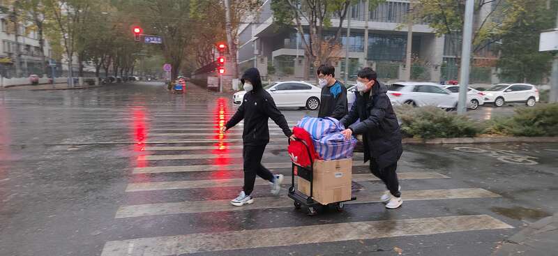 学校通过接诉即办平台收到学生反映的难题后,立即成立物品传递转运队伍,学院书记、院长和师生志愿者行动起来,有的在校内帮忙打包学生物资,有的在校外接应、及时将学生所需物资送到学生手里。