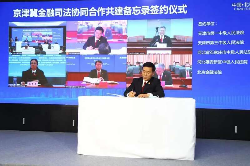 开幕式上,天津一中院院长张勇、天津三中院院长李秀杰、石家庄中院院长李霁、雄安新区中院党组书记任晓刚、北京金融法院院长蔡慧永共同在线签署了《京津冀金融司法协同合作共建备忘录》。上海金融法院院长赵红、深圳中院院长张应杰、北京金融法院院长蔡慧永共同在线签署了《金融专业化审判合作共建备忘录》。