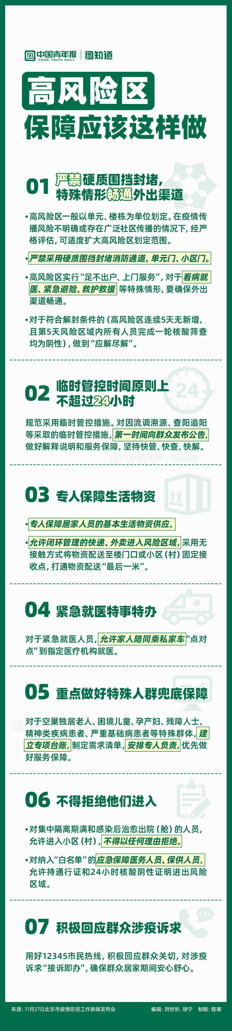严禁采用硬质围挡封堵消防通道、单元门、小区门;看病就医、紧急避险、救护救援等特殊情形要确保外出渠道畅通;临时管控时间原则上不超过24小时;紧急就医人员允许其家人陪同乘私家车“点对点”到指定医疗机构就医;不得以任何理由拒绝出院(舱)人员回小区……今日,北京明确社区防控尤其是高风险区的就医、物资、安全等方面保障的标准。转发收藏!