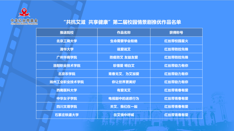 据了解,本次活动共收到来自清华大学、复旦大学等52所院校的情景剧作品和3部志愿者团队作品,在评审阶段收到80余万张大众投票,及线上62位专家的评审意见,获130余万人次浏览量。当日活动揭晓10部推优作品、3部志愿者团队作品及特别推荐的5部情景剧作品,分别被授予“红丝带校园星火”“红丝带防控先锋”“红丝带助力有你”等称号。