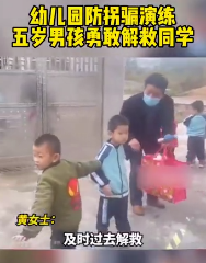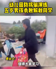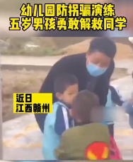 近日,江西赣州一幼儿园进行防拐演练,仅有5岁的小男孩意识到同伴有被拐风险,一把拽住被骗小伙伴的胳膊,身体用力前倾努力将他拽离“坏人”,为他的勇敢点赞!