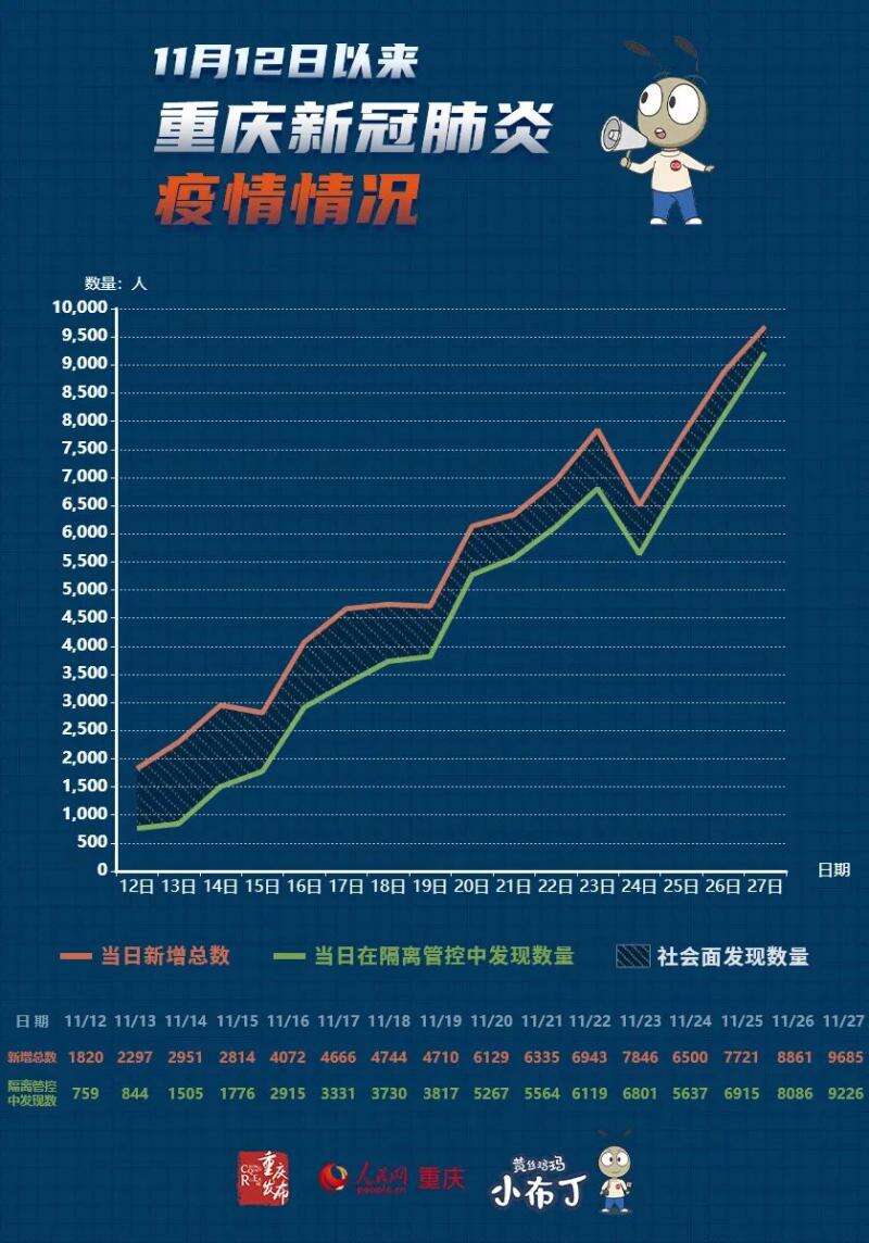 就中心城区而言,11月27日共报告新增感染者8750例,比26日增加708例;其中,渝中区、渝北区、江北区、九龙坡区、南岸区新增感染者均超过1000人,合计7479人,较26日增加617人,占中心城区的85.47%。另一方面,中心城区社会面发现感染者降至337人,占比低至3.85%,大渡口区、沙坪坝区、北碚区、巴南区、两江新区、重庆高新区等6个区当日均未报告社会面感染者。同时,中心城区新增社会面清零镇街8个、村(社区)41个,总共有126个镇街、1573个村(社区)已实现社会面清零。