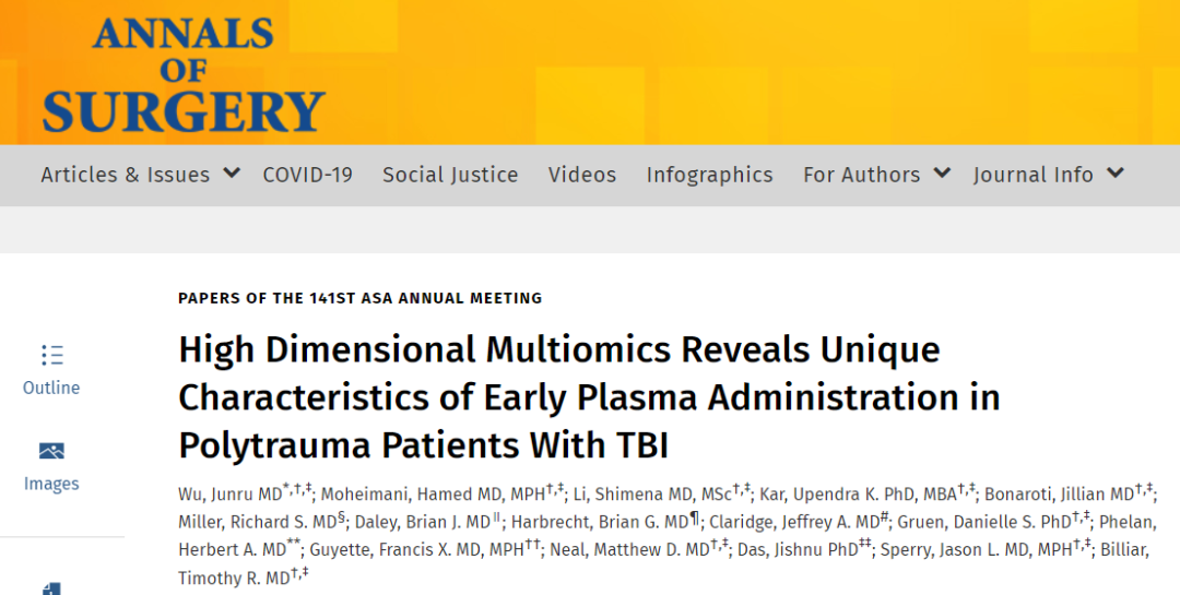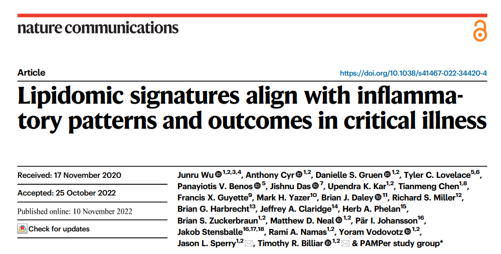 近日,中南大学湘雅三医院心血管内科及临床试验研究中心的伍俊儒博士和美国匹兹堡大学Timothy R. Billiar教授合作团队有关创伤后干预效应与预后评价原创性研究成果“脂质组学标志与炎症模式及重症疾病预后关联”及“高维多组学揭示伴有颅脑损伤的创伤患者对于早期血浆复苏独特反应”先后在国际顶级学术期刊《自然通讯》(Nature Communications)、《外科学年鉴》(Annals of Surgery)发表。