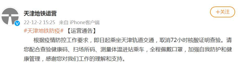 据@天津地铁运营 消息,根据疫情防控工作要求,即日起乘坐天津轨道交通,取消72小时核酸证明查验。请乘客配合查验健康码、扫场所码、测量体温进站乘车,全程佩戴口罩,加强自我防护和健康管理。