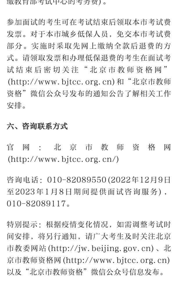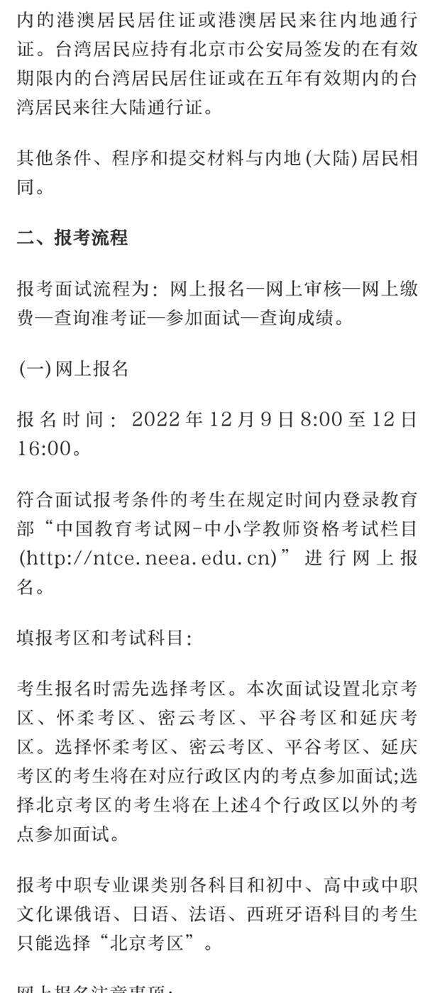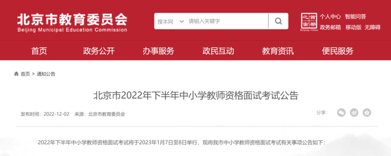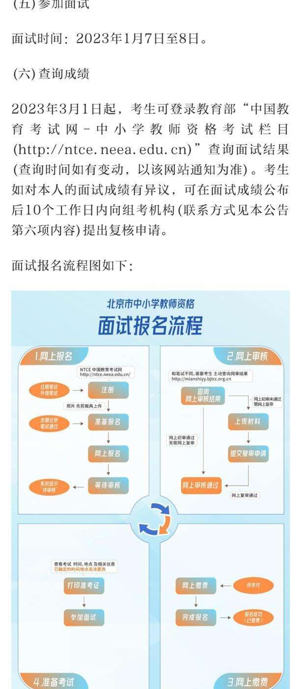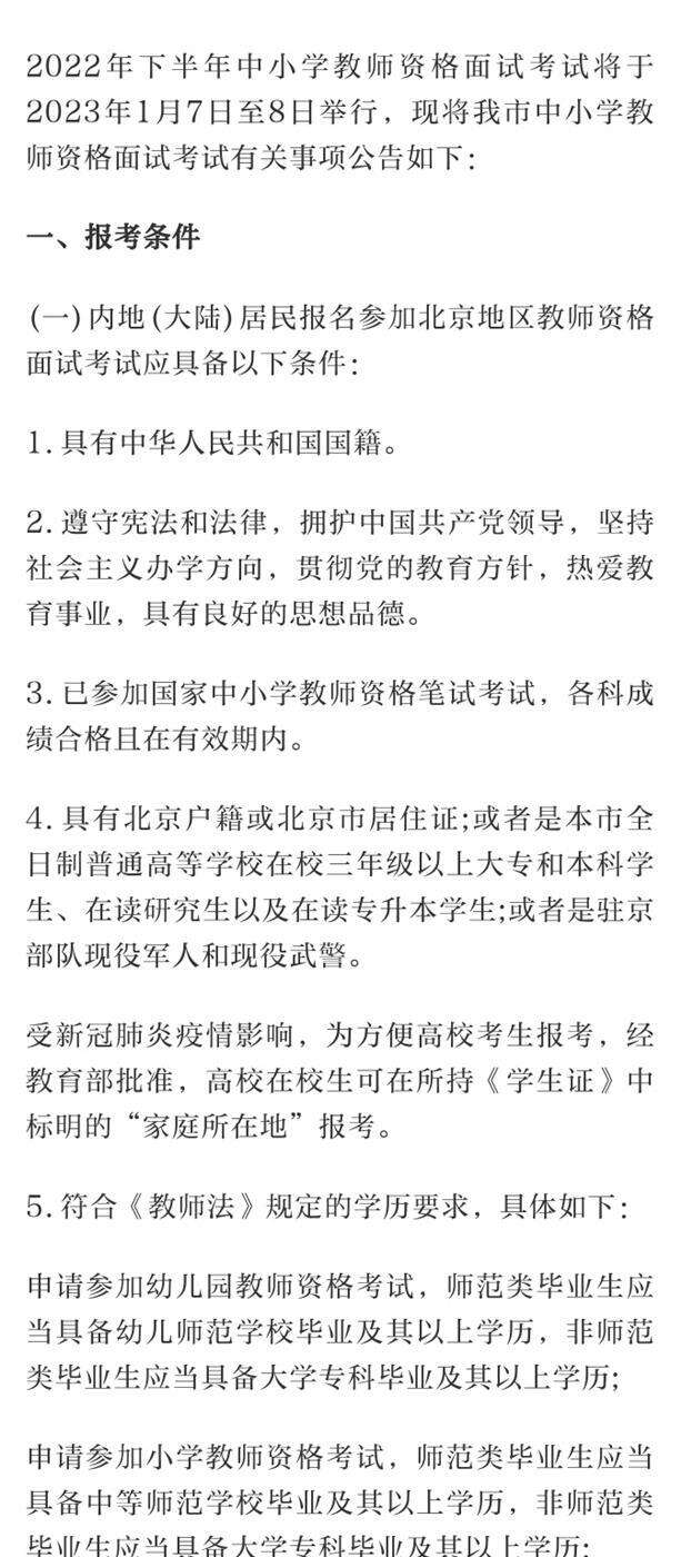 北京市教委网站发布公告,明确2023年1月7日至8日举行2022年下半年中小学教师资格面试考试,并同时公告了报考条件、报考流程、面试内容及科目等相关信息。