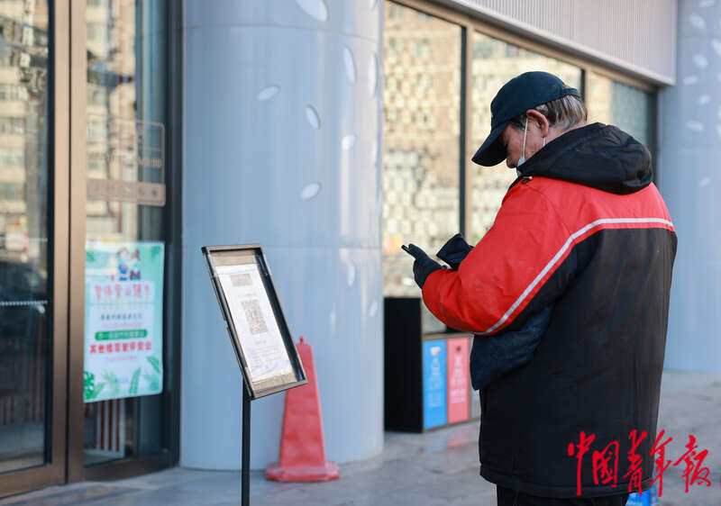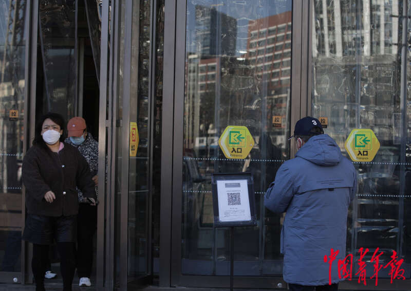 12月6日,北京市朝阳区一家商场门口,市民准备扫码进入。进入商场内的店铺需要二次扫码。中青报·中青网记者 曲俊燕/摄