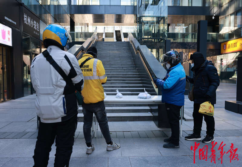 12月6日,北京市朝阳区一处写字楼楼下,外卖员们将餐品放在专门的取餐处,目前他们还无法进入写字楼内送餐。中青报·中青网记者 曲俊燕/摄