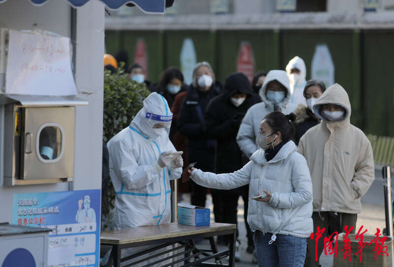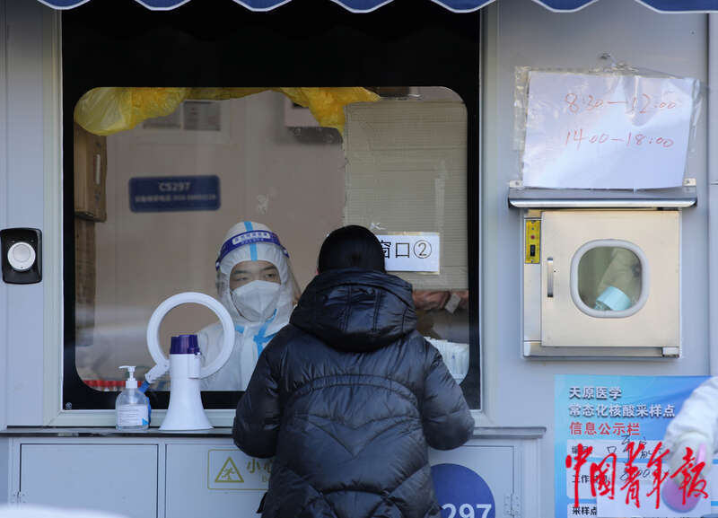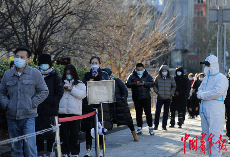 12月6日,北京市朝阳区某核酸检测点,市民进行核酸检测。中青报·中青网记者 陈剑/摄