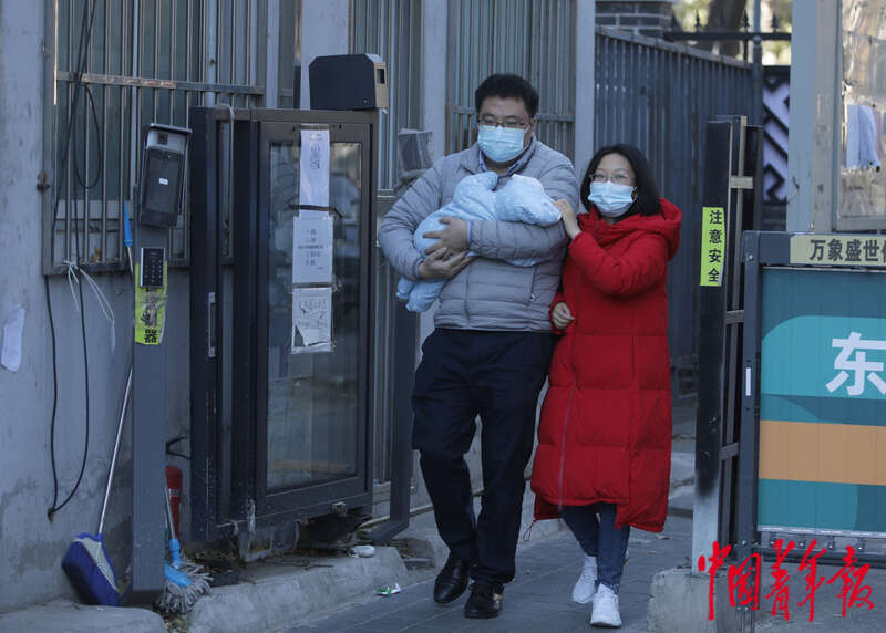 12月6日,北京市朝阳区某社区,居民抱着孩子从门口直接进入。当日,北京核酸检测查验实行新措施,进入社区(村),不查验核酸检测阴性证明,常住居民可不扫码。中青报·中青网记者 陈剑/摄