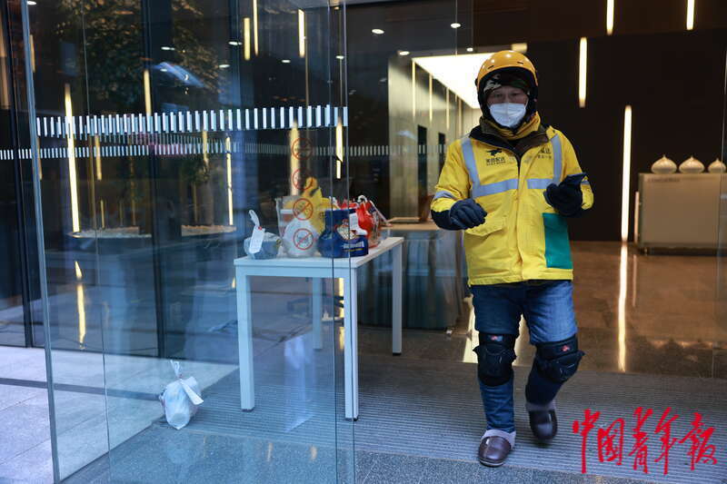 12月6日,北京市朝阳区一处写字楼入口,外卖员将餐品放置在门口的桌上后准备离开。据这处写字楼的工作人员介绍,目前进入写字楼内只需使用北京健康宝扫码,不需要查验核酸天数。中青报·中青网记者 曲俊燕/摄