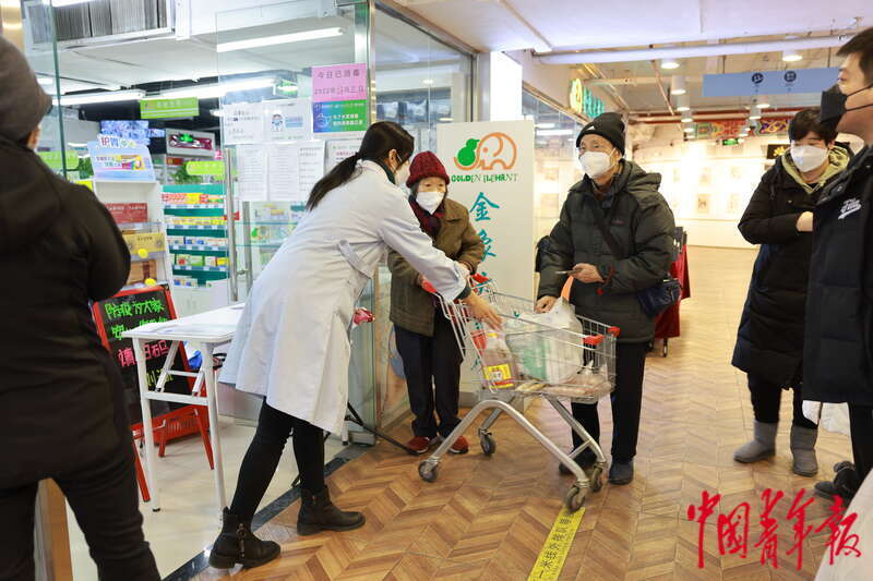 12月6日,北京市朝阳区一家药店门口,店员提醒购药者保持一米距离。目前该药店暂时仍需查验核酸检测48小时内阴性证明。中青报·中青网记者 曲俊燕/摄