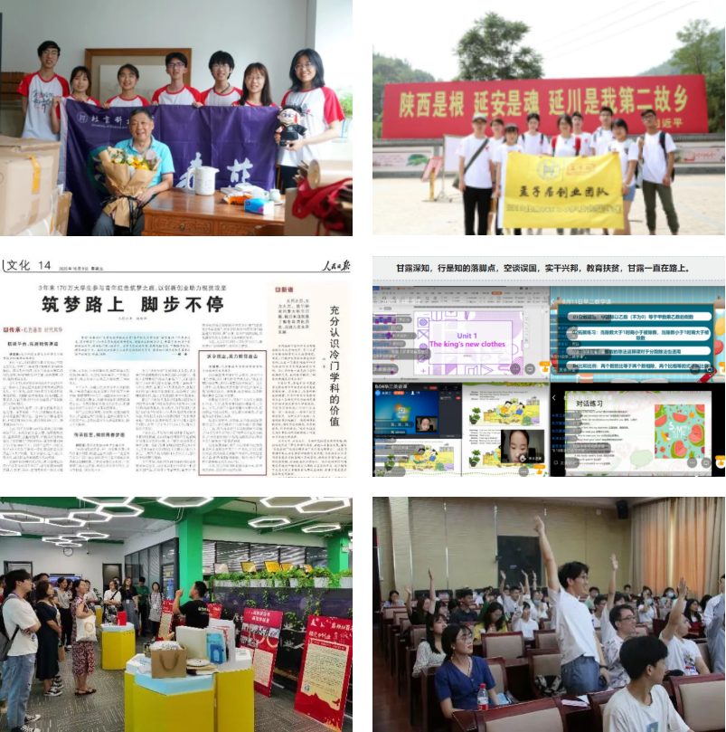 “孟子居”公益电商创业团队大力探索直播助农、科技助农渠道;“铜仁看点”创业团队带领家长村民致富,登上人民日报;“甘露”教育实践团为乡村儿童进行党史学习教育、云课堂,增强教育的带入性、趣味性、深刻性,实践活动也得到了地方主流媒体的报道;“京韵泰蓝”实践团设计了4种课程,与17个支教团合作,通过线上的方式在全国11个省市地区宣讲景泰蓝文化……学生将课程所学的“创新创业为了人民”的立场、“围绕价值观开展业务”的核心思维等,融入到社会实践团队管理和业务开展中,真真切切从行动中获得真体验,从真体验中领悟“跟党学创业”的真力量。