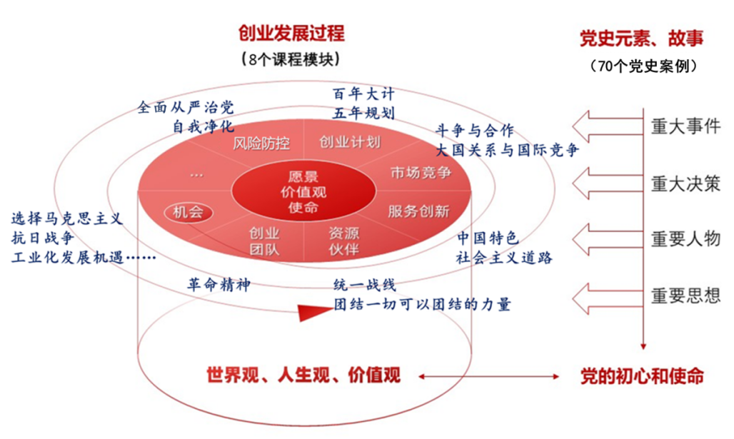 学校成立“思创融合”工作室,以“党是伟大的创业组织”为视角,以“党的百年发展奋斗史”为元素,以“厘清创业逻辑+聚焦核心知识+融入党史故事”为思路,创新打造了《跟党学创业》公选课,用“新理念、新形式、新话语体系”诠释百年党史里具有创新创业精神的人与事,归纳出创新创业过程中的应有信念、应循规律、应备素质,引导新时代青年在干事创业过程中树立正确价值观,从中国共产党的百年发展史中汲取奋斗智慧和力量,实现了“党史学习”与“创新创业教育”的一次双向奔赴。
