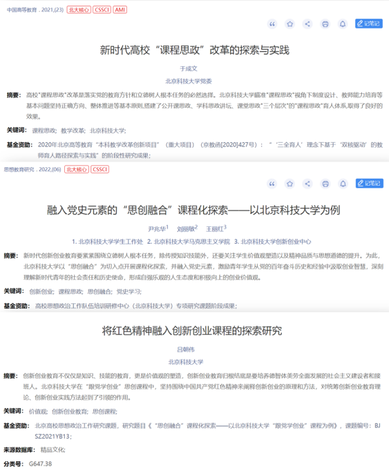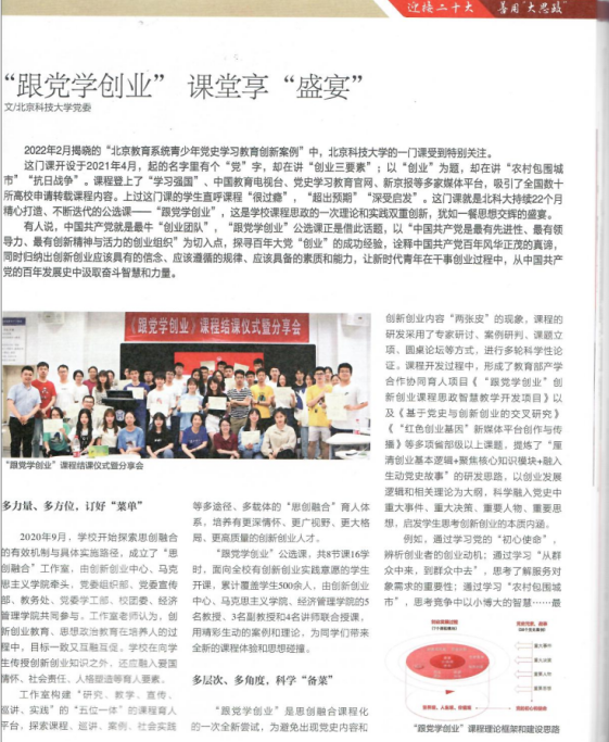 “跟党学创业”现已完成4项省部级以上课题立项,发表和录用相关论文7篇,形成近20万字的课程案例集。先后在十九届全国高校青年德育工作者论坛、北京高校就业创业课程思政建设培训班做专题经验介绍,并获评“北京教育系统青少年党史学习教育创新案例”。