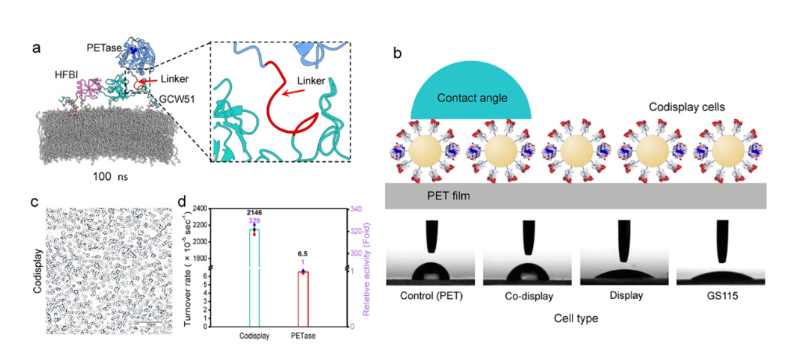 图1. 酵母全细胞生物催化系统。(a)吸附模块疏水蛋白HFBI和降解模块PETase通过表面共展示技术固定到毕赤酵母细胞表面在100 ns的分子动力学模拟示意图;(b)共展示细胞接触角及示意图;(c)共展示细胞在疏水性PET表面的吸附;(d)最佳反应条件下共展示细胞和野生型PETase以PET为底物的周转率。
