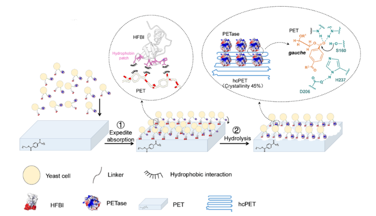 图2.全细胞催化系统水解hcPET示意图。首先,由于吸附模块HFBI的存在,共展示细胞迅速吸附到hcPET表面,且在hcPET上的吸附率接近100%。随后,降解模块PETase接触高结晶度PET的表面,并以顺式构象水解PET链,从而实现高结晶度PET的高效水解。