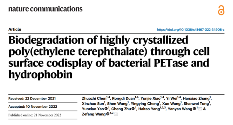 2022年11月21日,天津大学生命科学学院王泽方教授课题组在《自然-通讯》(Nature Communications)上发表题为“Biodegradation of Highly Crystallized Poly(ethylene terephthalate) Through Cell Surface Codisplay of Bacterial PETase and Hydrophobin”的研究论文,构建了一种工程化的全细胞酵母催化剂实现高结晶度PET(hcPET)的高效降解。此研究是该课题组在生态安全领域(PNAS,2021,33876762;PNAS, 2021,34620712;Nature Communications, 2022, 35338130)的又一重要进展。