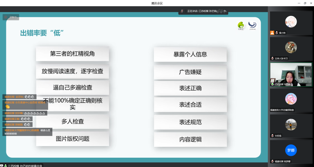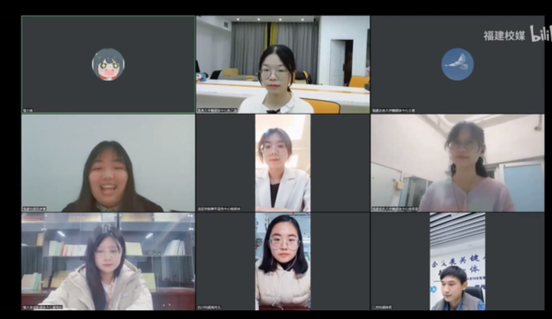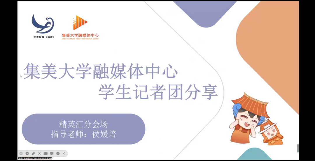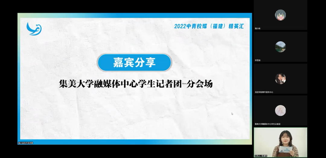 在介绍了集美大学融媒体中心学生记者团的概况、自我定位与吉祥物周边后,集美大学的小伙伴们从新媒体文案写作、选题、短视频制作、公众号运营等方面分享经验,帮助众多校媒人解答疑惑,传递新媒体运营的理念及方法。