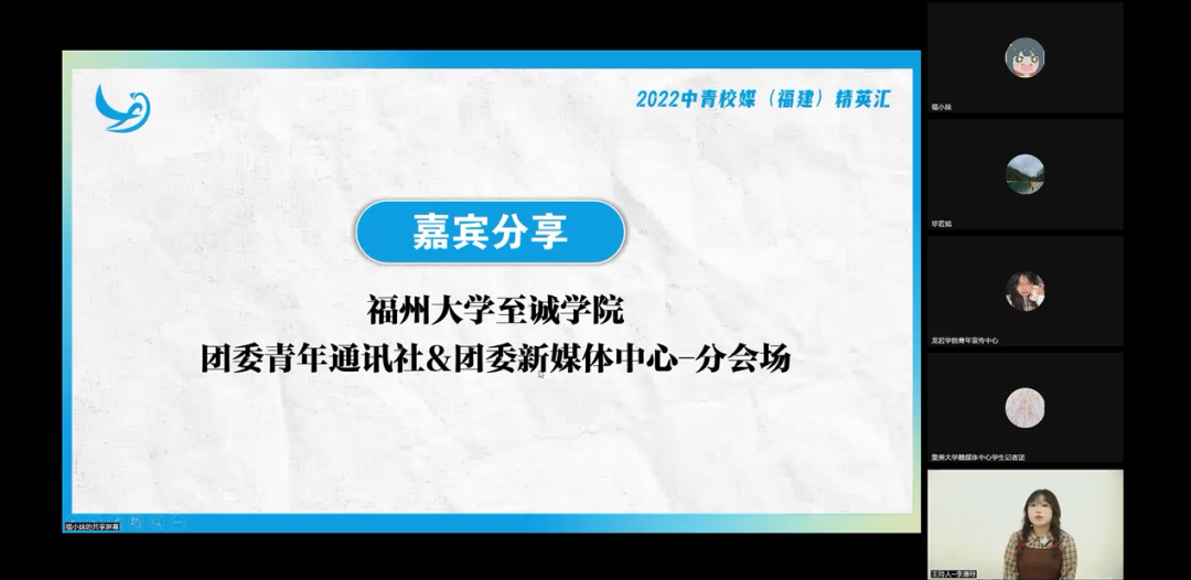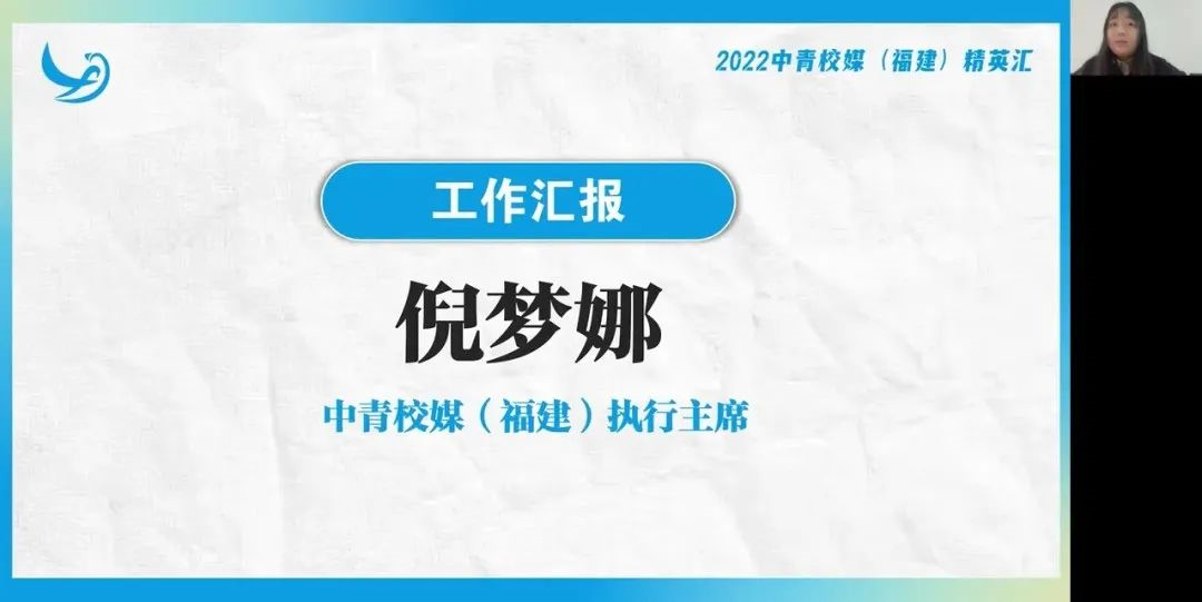 而后,中青校媒(福建)第14届主席团代表、执行主席倪梦娜从内容产出、渠道建设、特色活动、组织管理四个方面汇报福建校媒近半年来的总体工作状况。八闽文化系列推文、音频栏目《为你读书》、微信公众号视频号中原创视频的拍摄、福小妹系列表情包与周边的推出等都彰显了福建校媒作为官方媒体的深厚实力。同时福建校媒积极联络各会员媒体又加强了与其他区域校媒的联系,多次展开联动活动。六大部门因部制宜,保证了校媒的高质量发展。