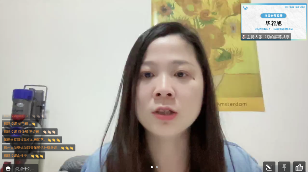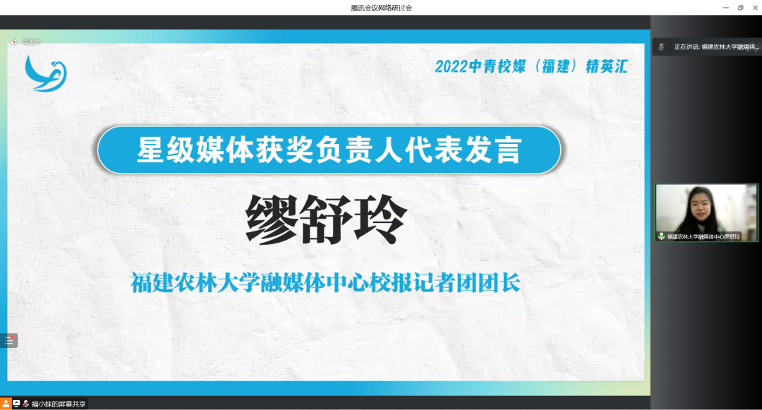 冯雯欣在发言的过程中提到,她在福建校媒学到了更多的排版技巧,明白了如何把推文做得更精美细致;学会了如何更好地管理一个部门,做好日常工作的规划与分配……校媒的工作让她收获温暖、热爱与快乐。在此她衷心地祝愿未来福建校媒能越来越好,有更多同大家一样热爱新闻、热爱媒体的伙伴们加入这个行列!