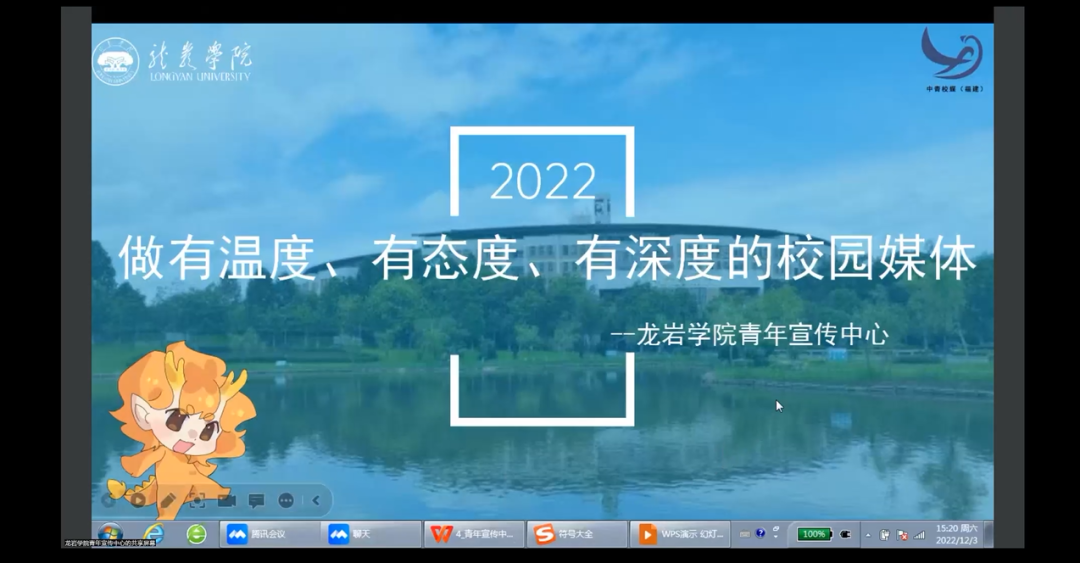 在陈飞老师总结本年度工作后,来自影视采编部、新闻分享部、微信运营部的几位代表分享了关于抖音运营、照片拍摄、新闻采写等方面的经验,同时展示了他们的优秀作品。其吉祥物小龙人贯穿汇报始终,收获了广大校媒朋友的喜爱。小龙人的周边抽奖掀起了精英汇的一波小高潮。