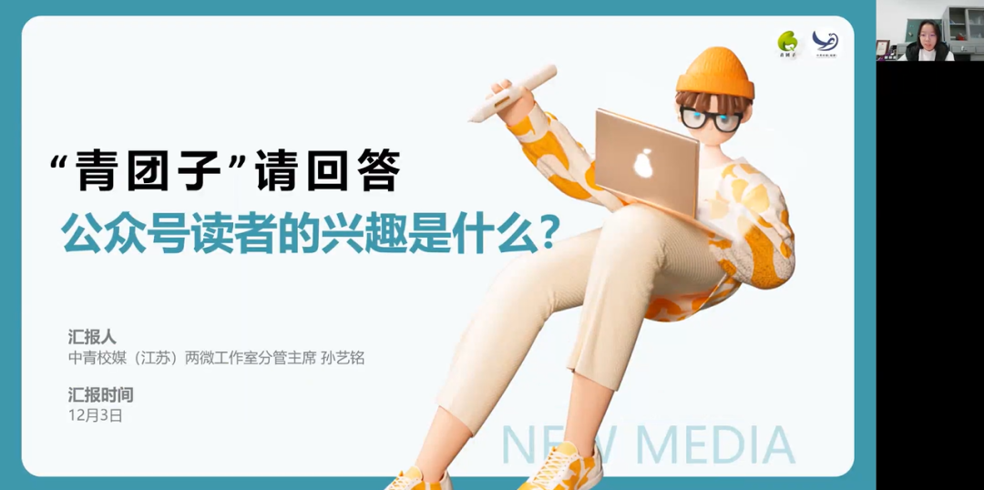 中青校媒(江苏)第十四届两微工作室分管主席孙艺铭以公众号“青团子”为例,介绍两微工作室中微信工作的构成部分,并围绕“公众号读者的兴趣是什么”这一话题进行“快、准、狠”三大路径的经验分享。