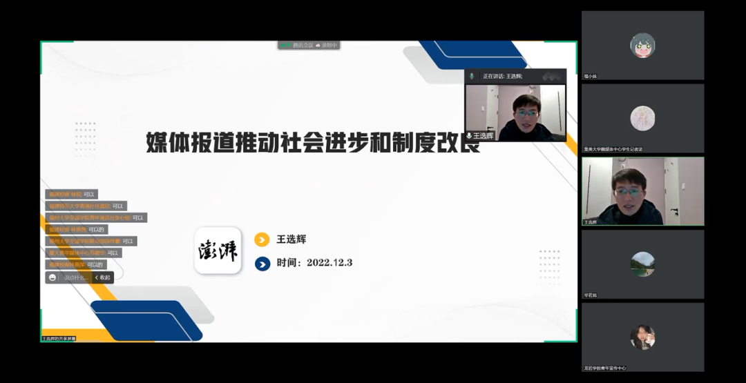澎湃新闻记者王选辉老师带来主题为“媒体报道推动社会进步和制度改良”的分享。他先用当初轰动全中国的“一次性筷子增税事件”做例子,提醒广大媒体人,要时刻反思自己所写内容是否严谨,是否已了解事情的全貌。作为媒体人要注意用词的准确性,反复推敲寻找事情的真相。媒体人要有“自己的文章可能影响一群人命运”的自觉,认真斟酌笔下的每一句话。后通过讲述“农家女被冒名顶替上大学”的案例,告诉我们媒体报道始终要抱有着推动社会进步和制度改良的驱动力,放平心态做好记录工作,尝试带来一些改变。