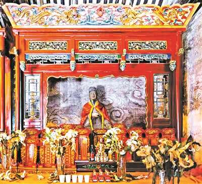 像村里的其他几座庙一样,这座关帝庙铁锚寺也比较紧凑,三合院的格局,小小院落,主殿和两侧配殿都是三间。主殿的正中是关公的塑像,左手边一张铺着黄布的桌子上摆着一个崭新的红色大铁锚。