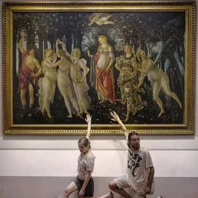 容华:其实在查阅资料前,我甚至没有意识到今年发生过这么多起抗议。此类抗议似乎没能引起广泛的社会关注,大众对抗议仅仅有一个大致印象。我先列举几起比较有代表性的事件。今年5月,曾有环保主义者在卢浮宫里向《蒙娜丽莎》扔蛋糕,引发了一定的社会关注。随后在7月,在伦敦国家美术馆有环保主义者用被划成三道的纸质复制品覆盖约翰·康斯泰伯尔的画作《干草车》。两位抗议者还把手粘到画框上,对画框造成轻微损坏。尽管没有获得大量关注,但主流舆论对他们的行为持批评态度。同样是7月,在佛罗伦萨乌菲兹美术馆内,两位环保主义者在另一位同伴的帮助下,将手粘在波提切利的《春》上。此后的10月,三位环保主义者在荷兰海牙的莫瑞泰斯宫试图破坏约翰内斯·维米尔的名画《戴珍珠耳环的少女》。在后两起事件中,画作均没有受到破坏,这些事件也没有受到广泛关注。包括之后梵高的《向日葵》被泼番茄汤,莫奈的《干草堆》被泼土豆泥等事件都未能引起太多讨论。