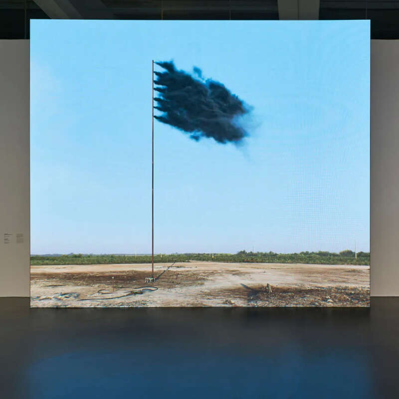 木然:我之前在尤伦斯当代艺术中心的“计算机艺术简史”展览里看到约翰·杰勒德的作品 《西部旗帜(纺锤顶油田,得州)》。人们一进去就能看到LED屏幕上飘扬的旗帜,但这面旗帜不是由布织成,它是从管道中飘出黑烟,形成一个旗帜。据艺术家描述说,这是1901年在德克萨斯州南部被开垦的油田,也是世界上第一个主要的油田,叫做纺锤顶油田,目前已经干涸了。艺术家用计算机,这种比较进步主义的技术去重现了这片土地,让这片油田在虚拟的真空世界里永远不会干涸。这个作品让我意识到,科学在艺术品当中也有自反和反思,它本身也是一个进步的教材。