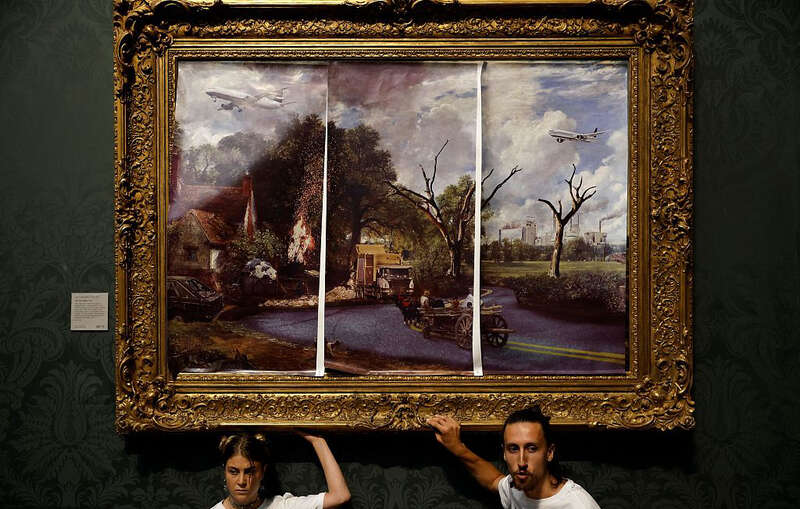 十木:综上所述,我认为事实和人们的认知存在两点差异。首先,气候活动人士在博物馆里的破坏行为并没有起到他们想达到的预期效果。第二,和大众所预想的不同,他们并没有对画作造成实质性损害,这些事件中最严重的破坏是对康斯泰伯尔的《干草车》画框的损害。
