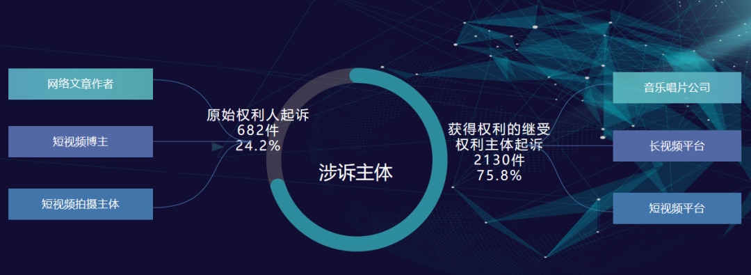 二是涉诉主体范围广泛,以长短视频平台为主。从起诉主体看,原始权利人起诉的有682件,包括网络文章作者、短视频博主、短视频拍摄主体等;通过许可协议等获得权利的继受权利主体起诉的有2130件。从被诉主体看,起诉短视频平台的有899件,起诉网络用户的有1449件。