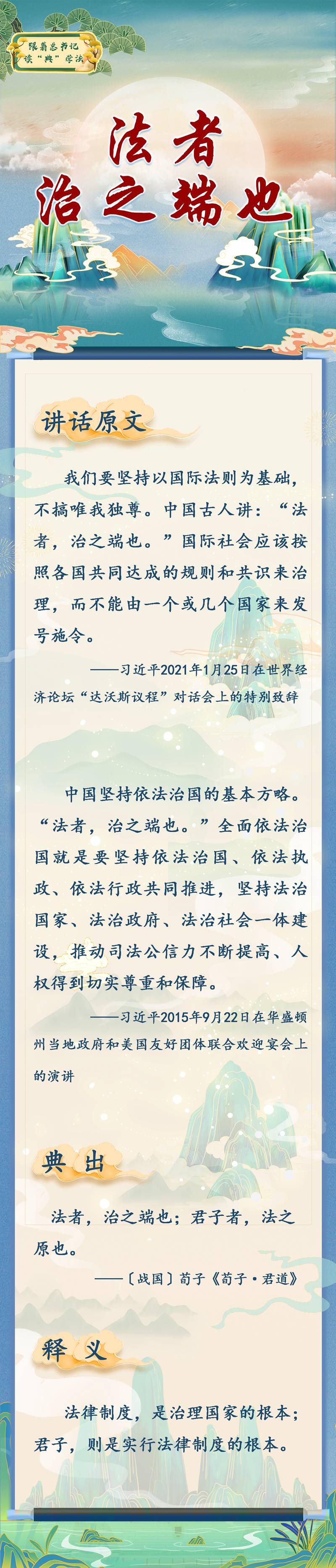 “法者,治之端也。”历史和现实都告诉我们,法治兴则国兴,法治强则国强。全面依法治国关系党执政兴国,关系人民幸福安康,关系国家长治久安。新时代新征程上,我们要运用好法律这一治国理政最重要的规矩,传承“约法三章”所彰显的中华优秀传统法律文化智慧,全面推进国家各方面工作法治化,在全面建设社会主义现代化国家过程中充分发挥全面依法治国的基础性、保障性作用。
