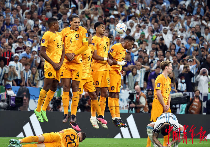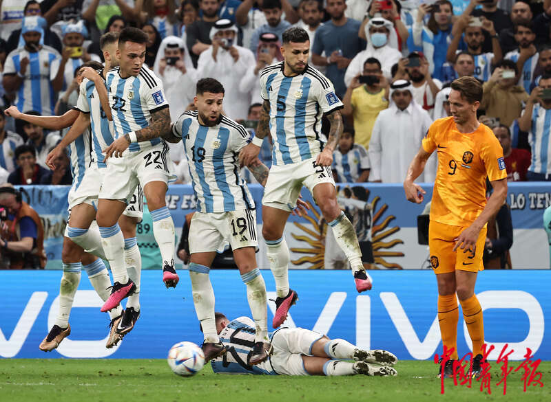 12月10日,卡塔尔卢塞尔球场,2022卡塔尔世界杯1/4决赛阿根廷对阵荷兰的比赛中,荷兰队任意球穿越阿根廷队人墙。刘占崑/摄