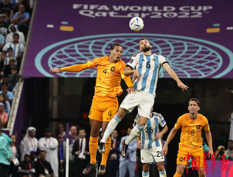 12月10日,卡塔尔卢塞尔球场,2022卡塔尔世界杯1/4决赛阿根廷对阵荷兰的比赛中,荷兰队范戴克(前左)与阿根廷队佩泽拉争顶头球。刘占崑/摄