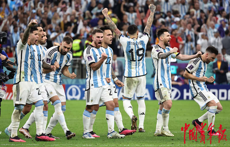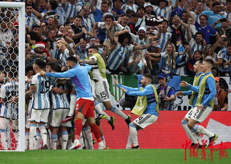 12月10日,卡塔尔卢塞尔球场,2022卡塔尔世界杯1/4决赛阿根廷对阵荷兰的比赛中,阿根廷队员庆祝点球领先。刘占崑/摄