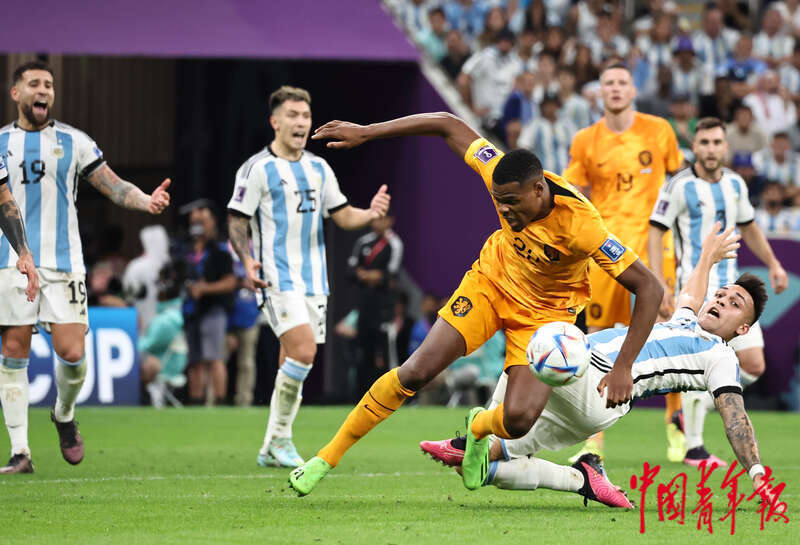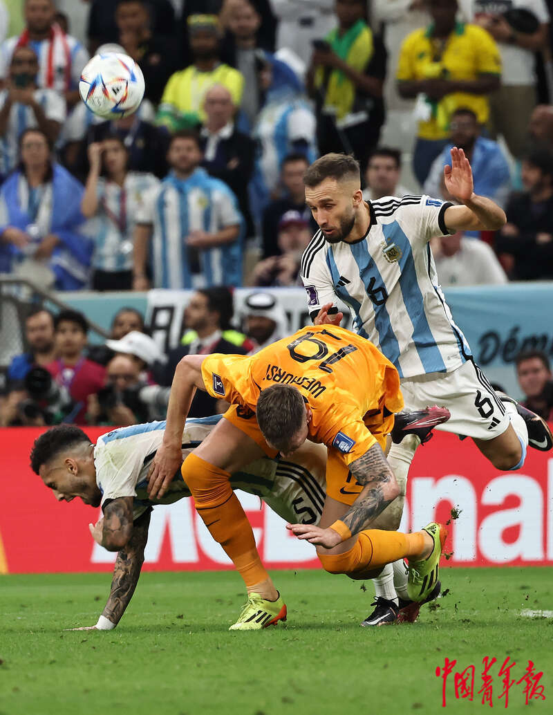 12月10日,卡塔尔卢塞尔球场,2022卡塔尔世界杯1/4决赛阿根廷对阵荷兰的比赛中,双方球员激烈拼抢。刘占崑/摄