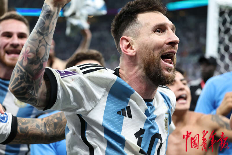12月10日,卡塔尔卢塞尔球场,2022卡塔尔世界杯1/4决赛阿根廷对阵荷兰的比赛中,梅西庆祝比赛胜利。刘占崑/摄