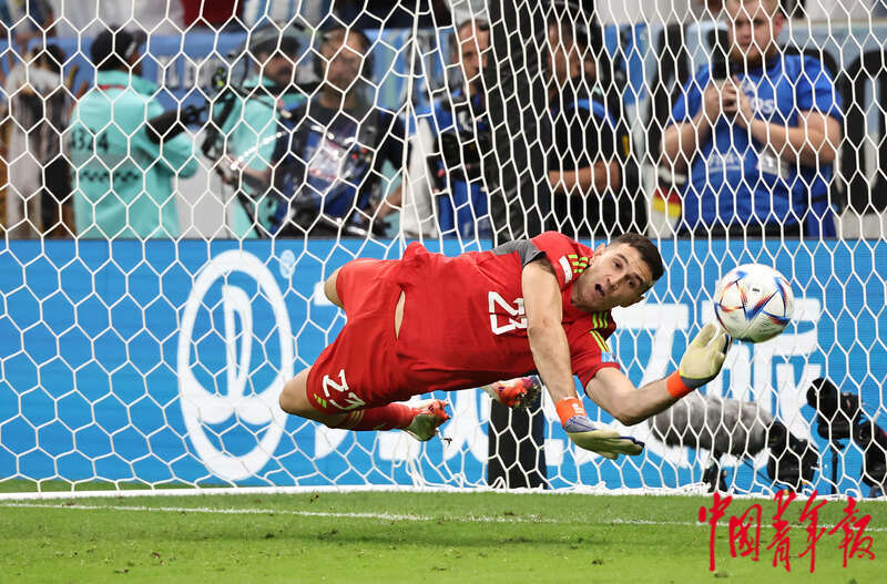 12月10日,卡塔尔卢塞尔球场,2022卡塔尔世界杯1/4决赛阿根廷对阵荷兰的比赛中,阿根廷门将马丁内斯扑出点球瞬间。刘占崑/摄