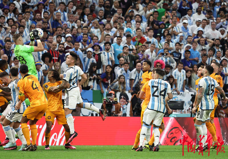 12月10日,卡塔尔卢塞尔球场,2022卡塔尔世界杯1/4决赛阿根廷对阵荷兰的比赛中,荷兰队门将诺珀特(绿衣)高高跃起,将球没收。刘占崑/摄