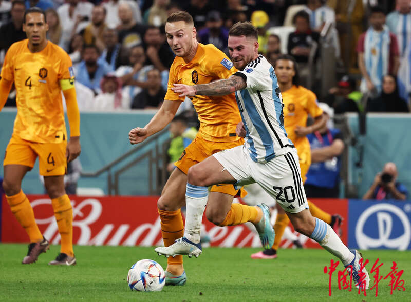 12月10日,卡塔尔卢塞尔球场,2022卡塔尔世界杯1/4决赛阿根廷对阵荷兰的比赛中,阿根廷队麦卡利斯特(前右)奋力带球。刘占崑/摄